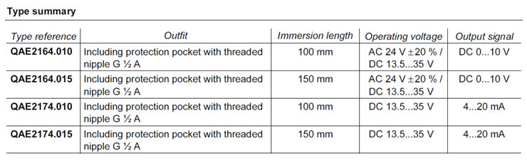 西門子水溫傳感器QAE2164和QAE2174英文樣本