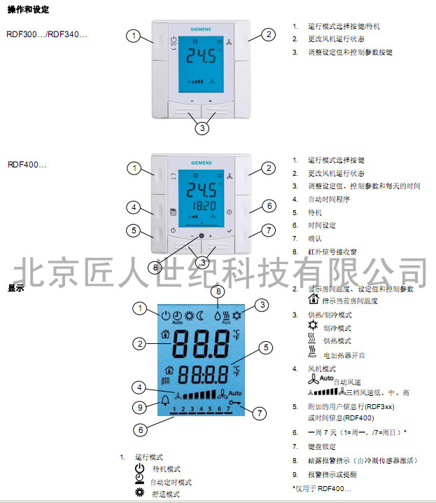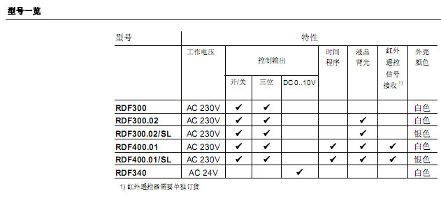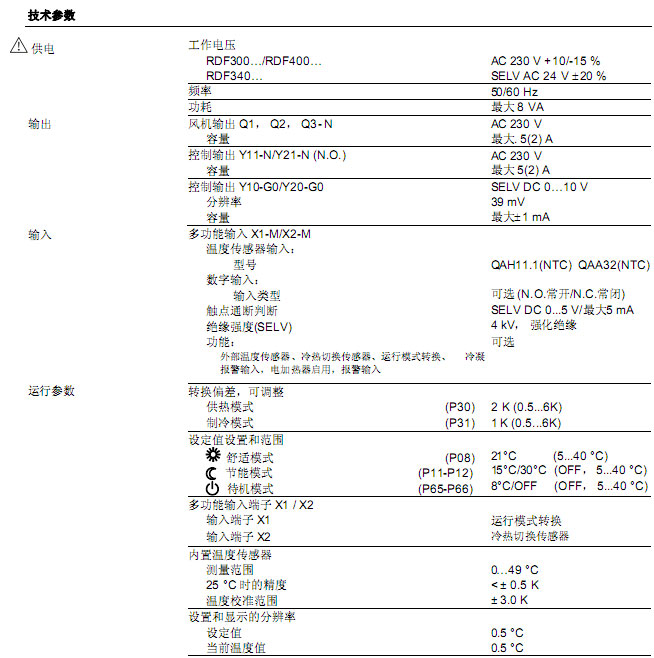 西門子溫控器RDF300,RDF300.02,RDF340 - RDF300,RDF300.02工作電壓AC230V,開/關(guān)或三位控制輸出 - RDF340 工作電壓AC24V,DC0-10V控制輸出 - 三速或單速風(fēng)機控制輸出 - 兩個多功能輸入,可用于酒店門卡、外接傳感器等 - 工作模式:舒適模式,節(jié)能模式和待機模式(保護模式) - 自動或手動冷熱切換 - 可調(diào)整的調(diào)試參數(shù)和控制參數(shù) - 最小和最大設(shè)定值限制(用于公共建筑節(jié)能) RDF300.02的附加功能:LCD液晶背光 RDF400.01的附加功能:LCD液晶背光,紅外遙控信號接收功能,自動定時模式(7*8時段) RDF300系列溫控器可用于單個房間和區(qū)域的溫度控制,這些房間或區(qū)域為: - 兩管制風(fēng)機盤管供熱和制冷 - 兩管制帶電加熱器的風(fēng)機盤管供熱和制冷 - 四管制風(fēng)機盤管供熱和制冷 RDF300溫控器可控制 - 一個單速或三速風(fēng)機 - 一個或兩個開/關(guān)信號控制的水閥執(zhí)行器和一級電加熱器 - 一個三位控制的水閥執(zhí)行器 RDF340溫控器可控制 - 一個單速或三速風(fēng)機 - 一個或兩個0-10V信號控制的水閥執(zhí)行器 - 一個0-10V信號控制的水閥執(zhí)行器和一個可調(diào)節(jié)的電加熱器(0-10V) 適用于以下系統(tǒng): - 單熱或單冷系統(tǒng) - 自動冷熱切換 - 手動冷熱切換 - 制冷和供熱(四管制風(fēng)機盤管系統(tǒng))/ RDF300系列溫控器功能 - 根據(jù)內(nèi)置溫度傳感器或外置溫度傳感器(回風(fēng)或室內(nèi)傳感器)控制房間溫度 - 自動或手動冷熱切換 - 通過溫控器上的運行模式來選擇運行模式 - 單速或三速風(fēng)機控制(自動或手動控制) - 最大和最小設(shè)定值限制 - 鍵盤鎖(自動或手動) - 兩個多功能輸入(X1,X2)可以選擇用于: - - 工作模式切換觸點(配合酒店房卡或門磁開關(guān)) - - 自動冷熱切換傳感器 - - 外置溫度傳感器 - - 露點監(jiān)測 - - 電加熱器啟用/禁用 - - 報警輸入 - 風(fēng)機優(yōu)化控制功能:風(fēng)機周期性運轉(zhuǎn),風(fēng)機增壓啟動,可選擇的風(fēng)機運行 - 在使用兩通閥的兩管制系統(tǒng)中實現(xiàn)清洗功能 - 過濾網(wǎng)清洗提醒 - 地板采暖地面溫度限制(配合外置傳感器QAH11.1) 西門子溫控器RDF300,RDF300.02,RDF400.1,RDF340接線圖
